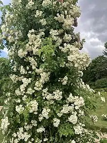 Ce rosier liane peut atteindre 365 cm de hauteur voire plus encore, pour une largeur de 245 cm. Son feuillage est lustré et vert clair et ses rameaux très peu épineux. Ses petites fleurs en gros bouquets sont blanches, semi-doubles à doubles et peu parfumées. La floraison généreuse a lieu au mois de juin[2].
