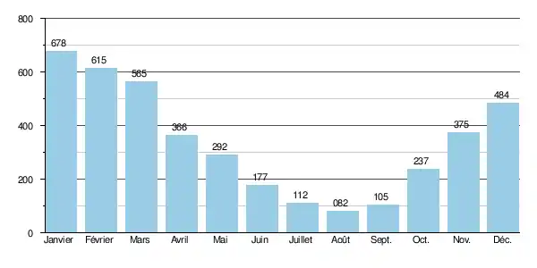 Les crues peuvent être très importantes, compte tenu bien sûr de l'exiguïté du bassin versant de la rivière et de la petitesse de son module. Les QIX 2 (quantité instantanée maximale sur deux ans) et QIX 5 valent en effet respectivement 11 et 17 m3/s. Le QIX 10 est de 21 m3/s et le QIX 20 de 25 m3/s. Quant au QIX 50, il n'a pas été calculé, faute d'une durée d'observation suffisante pour le déterminer valablement, mais est estimé à 30 m3/s.