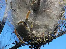 Certaines chenilles processionnaires (ici : Thaumetopoea processionea) peuvent être à l'origine d'allergies graves (respiratoire, cutanée, des muqueuses ou de l'œil).