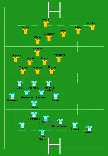 | Essai(s) : 7 Imhoff (1re), Gallo (5e, 63e), de la Fuente (23e), González (30e), Boffelli (77e), Albornoz (80e+1) Pénalité(s) : 1 Boffelli (53e) |