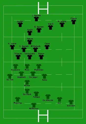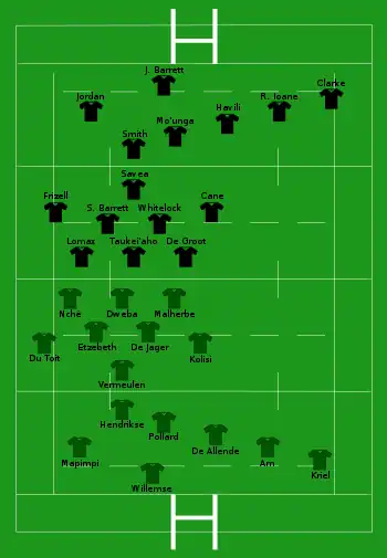- Bongi Mbonambi (Afrique du Sud) est tout d'abord inscrit sur la feuille de match au poste de titulaire, cependant une blessure quelques jours avant le match le force à déclarer forfait, il est remplacé par Joseph Dweba
