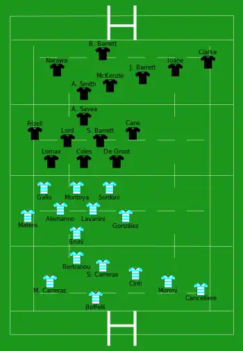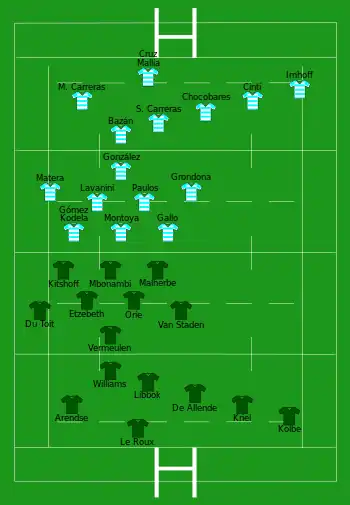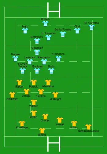 Rapport | Essai(s) : 4 de la Fuente (24e), Montoya (45e), M.Carreras (68e), González (78e) Transformation(s) : 4 Boffelli (26e, 45e, 69e, 80e) Pénalité(s) : 2 Boffelli (20e, 59e) | ||