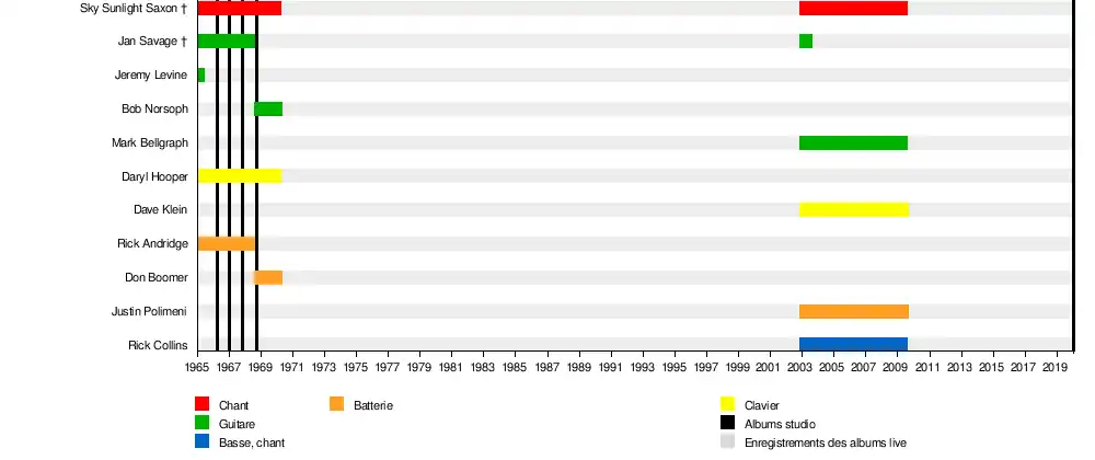 En 1965, Richard March, après quelques années d'une carrière solo infructueuse de chanteur à Hollywood, prend le pseudonyme de Sky Saxon et décide de former un groupe[4]. Il se met à la guitare basse et s’associe à l’ancien guitariste de surf music Jan Savage, au pianiste Daryl Hooper et au batteur Rick Andridge, tous deux originaires du Michigan. Ils cultivent volontairement une image excentrique. Ils gardent pendant un temps les cheveux longs et en désordre bien avant que cela ne soit la mode. Daryl Hooper se prétend dans les interviews vieux de plus de 200 ans et s’habille avec chemises à jabot et dentelles. Jan Savage joue sur ses origines amérindiennes et porte plumes et mocassins de cuir.