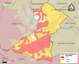 Le retrait-gonflement des sols argileux est susceptible d'engendrer des dommages importants aux bâtiments en cas d’alternance de périodes de sécheresse et de pluie. 94,5 % de la superficie communale est en aléa moyen ou fort (84,7 % au niveau départemental et 48,5 % au niveau national). Sur les 522 bâtiments dénombrés sur la commune en 2019, 515 sont en aléa moyen ou fort, soit 99 %, à comparer aux 86 % au niveau départemental et 54 % au niveau national. Une cartographie de l'exposition du territoire national au retrait gonflement des sols argileux est disponible sur le site du BRGM[27],[28].
