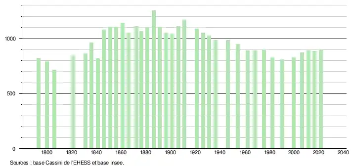 L'évolution du nombre d'habitants est connue à travers les recensements de la population effectués dans la commune depuis 1793. Pour les communes de moins de 10 000 habitants, une enquête de recensement portant sur toute la population est réalisée tous les cinq ans, les populations légales des années intermédiaires étant quant à elles estimées par interpolation ou extrapolation[37]. Pour la commune, le premier recensement exhaustif entrant dans le cadre du nouveau dispositif a été réalisé en 2006[38].