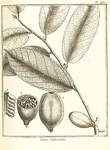 En 1775, le botaniste Aublet propose le Protologue suivant pour Cacao sylvestris (synonyme de Theobroma subincanum Mart.)[15] :