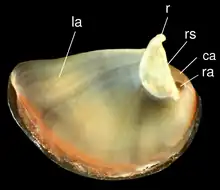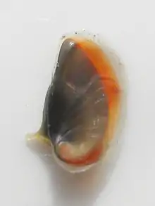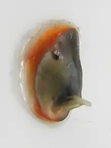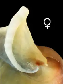 - Opercule : De nature calcaire, il a une forme de demi-lune (forme de D) tendant vers l'ovale. Il présente une apophyse marquée côté interne. La forme de cet apophyse diffère chez le mâle et la femelle (y compris chez le jeune individu)[10]. Ce dimorphisme sexuel est marqué par la forme de la zone frontière entre cet apophyse et le bouclier de l'opercule qui diffère selon le sexe : elle est droite chez les femelles, mais courbe chez les mâles[10].