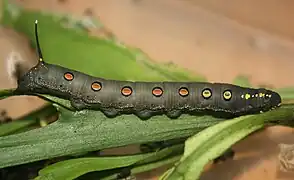 Elle est brun violacé pâle. Il y a une ligne subdorsale jaune et des points blancs avec une ligne latérale pâle au-dessous d'eux sur les somites thoraciques. Les ocelles à cercles noirs peuvent être observés sur les 4e et 10e somites, les deux premiers étant centrés sur le bleu et le postérieur sur le violet. Dans les premiers stades, les ocelles postérieurs sont centrés avec une couleur pourpre avec des bandes dorsales de taches jaunes