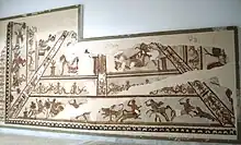Cette mosaïque[5], qui était l'un des deux pavements latéraux, reprend la forme d'une voûte et décline sur des bandes des combats de centaures et autres animaux, avec Satyres et Ménades, le tout avec un riche arrière-plan végétal[6].