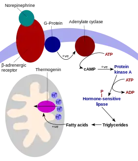 Elle est apparentée à d'autres transporteurs de biomolécules tels que le translocateur de nucléotides à adénine et agit comme un canal à protons à travers la membrane mitochondriale interne. Dans les cellules des tissus adipeux bruns, elle est activée par les acides gras et est inhibée par les nucléotides. Le mécanisme de signalisation cellulaire à l'œuvre à partir des terminaisons du système nerveux sympathique met en jeu la noradrénaline, qui se fixe à un récepteur β3-adrénergique de la membrane plasmique[2]. Celui-ci active une adénylcyclase via une protéine G, ce qui a pour effet de libérer de l'AMP cyclique dans le cytoplasme. L'AMP cyclique active une protéine kinase A, qui phosphoryle une lipase hormonosensible, ce qui a pour effet de l'activer et de cliver les triglycérides en libérant les acides gras qui les composent. Ces derniers activent la thermogénine, en annulant les effets inhibiteurs du GDP et de l'ATP. Cet effet se prolonge jusqu'à ce que les mitochondries aient oxydé tous les acides gras, ce qui lève l'activation de la thermogénine et rétablit l'imperméabilité de la membrane mitochondriale interne, ce qui rétablit le couplage de la production d'ATP avec la chaîne respiratoire.