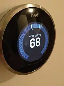 En 2011, Nest Labs a développé le Nest Learning Thermostat (en). Ce thermostat réduisait la consommation d'énergie domestique en s'attaquant aux problèmes des thermostats programmables par l'utilisation d'une meilleure technologie basée sur des capteurs, des algorithmes, de l'apprentissage automatique et de l'informatique en nuage. Ces technologies apprennent les comportements et les préférences des occupants, et ajustent la température à la hausse ou à la baisse afin de rendre l'occupant confortable lorsqu'il est chez lui et d'économiser l'énergie lorsqu'il est absent. En outre, le thermostat se connecte au réseau Wi-Fi de la maison. Cela permet aux utilisateurs de modifier la température, d'ajuster l'horaire et de vérifier la consommation d'énergie à partir d'un téléphone intelligent ou d'un ordinateur. Toutes ces fonctionnalités faisaient partie de l'objectif du Nest de créer un thermostat facile à utiliser qui permet aux utilisateurs d'économiser de l'énergie et de l'argent[13].