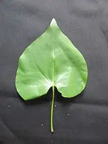 Ses feuilles longues de 10 à 30 cm sur un long pétiole sont en forme de cœur[2].