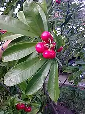 - dans le genre Thevetia, les fleurs ont une corolle hypocratériforme ou infundibuliforme jaune à blanchâtre, des appendices suprastaminaux deltoïdes, et le fruit est rouge, drupacé, segmenté avec quatre endocarpes fibreux, et des graines comprimées sans ailes ;