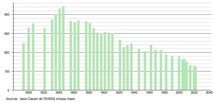 L'évolution du nombre d'habitants est connue à travers les recensements de la population effectués dans la commune depuis 1793. Pour les communes de moins de 10 000 habitants, une enquête de recensement portant sur toute la population est réalisée tous les cinq ans, les populations légales des années intermédiaires étant quant à elles estimées par interpolation ou extrapolation[16]. Pour la commune, le premier recensement exhaustif entrant dans le cadre du nouveau dispositif a été réalisé en 2004[17].