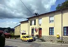 Commentaires : Ce blason, à l’initiale de la commune sous les armes ducales de Lorraine, figure sur la façade de la mairie. |
