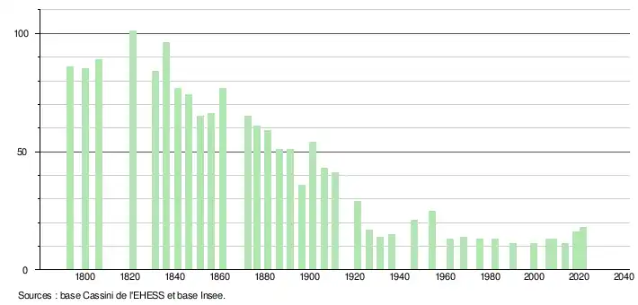 L'évolution du nombre d'habitants est connue à travers les recensements de la population effectués dans la commune depuis 1793. Pour les communes de moins de 10 000 habitants, une enquête de recensement portant sur toute la population est réalisée tous les cinq ans, les populations légales des années intermédiaires étant quant à elles estimées par interpolation ou extrapolation[17]. Pour la commune, le premier recensement exhaustif entrant dans le cadre du nouveau dispositif a été réalisé en 2008[18].