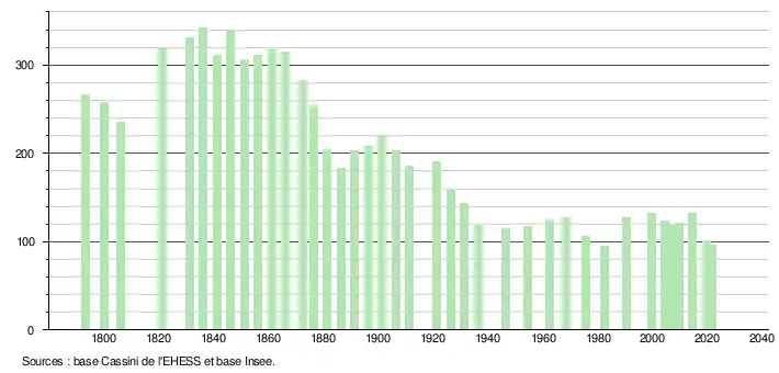 L'évolution du nombre d'habitants est connue à travers les recensements de la population effectués dans la commune depuis 1793. Pour les communes de moins de 10 000 habitants, une enquête de recensement portant sur toute la population est réalisée tous les cinq ans, les populations légales des années intermédiaires étant quant à elles estimées par interpolation ou extrapolation[27]. Pour la commune, le premier recensement exhaustif entrant dans le cadre du nouveau dispositif a été réalisé en 2004[28].