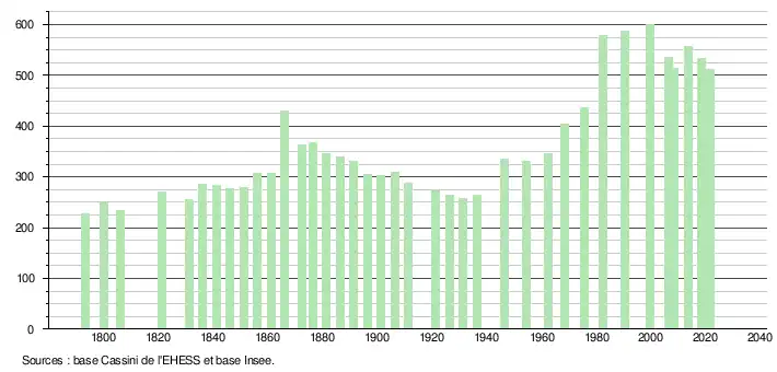 L'évolution du nombre d'habitants est connue à travers les recensements de la population effectués dans la commune depuis 1793. Pour les communes de moins de 10 000 habitants, une enquête de recensement portant sur toute la population est réalisée tous les cinq ans, les populations légales des années intermédiaires étant quant à elles estimées par interpolation ou extrapolation[22]. Pour la commune, le premier recensement exhaustif entrant dans le cadre du nouveau dispositif a été réalisé en 2008[23].