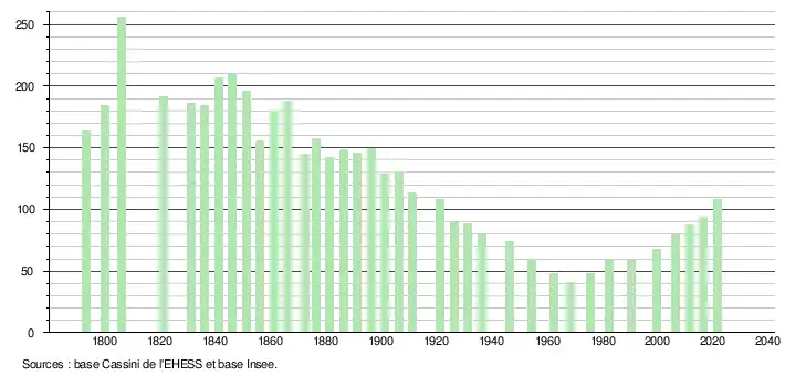 L'évolution du nombre d'habitants est connue à travers les recensements de la population effectués dans la commune depuis 1793. Pour les communes de moins de 10 000 habitants, une enquête de recensement portant sur toute la population est réalisée tous les cinq ans, les populations légales des années intermédiaires étant quant à elles estimées par interpolation ou extrapolation[18]. Pour la commune, le premier recensement exhaustif entrant dans le cadre du nouveau dispositif a été réalisé en 2006[19].