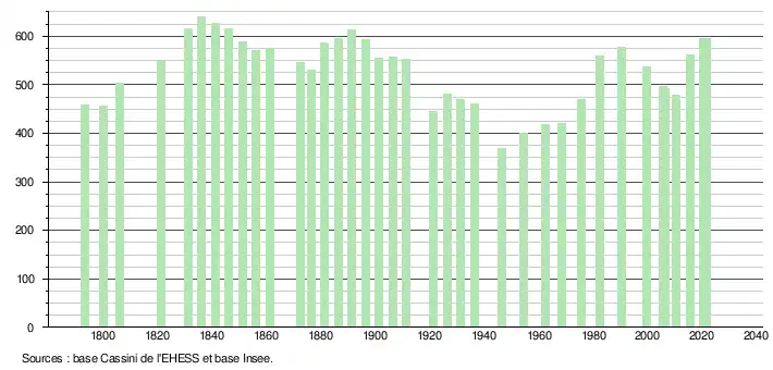 L'évolution du nombre d'habitants est connue à travers les recensements de la population effectués dans la commune depuis 1793. Pour les communes de moins de 10 000 habitants, une enquête de recensement portant sur toute la population est réalisée tous les cinq ans, les populations légales des années intermédiaires étant quant à elles estimées par interpolation ou extrapolation[19]. Pour la commune, le premier recensement exhaustif entrant dans le cadre du nouveau dispositif a été réalisé en 2005[20].