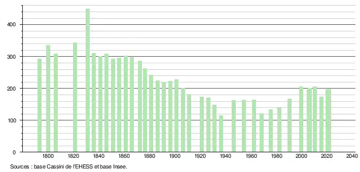 L'évolution du nombre d'habitants est connue à travers les recensements de la population effectués dans la commune depuis 1793. Pour les communes de moins de 10 000 habitants, une enquête de recensement portant sur toute la population est réalisée tous les cinq ans, les populations légales des années intermédiaires étant quant à elles estimées par interpolation ou extrapolation[19]. Pour la commune, le premier recensement exhaustif entrant dans le cadre du nouveau dispositif a été réalisé en 2005[20].