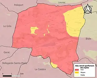 Le retrait-gonflement des sols argileux est susceptible d'engendrer des dommages importants aux bâtiments en cas d’alternance de périodes de sécheresse et de pluie. La totalité de la commune est en aléa moyen ou fort (88,8 % au niveau départemental et 48,5 % au niveau national). Sur les 440 bâtiments dénombrés sur la commune en 2019, 440 sont en aléa moyen ou fort, soit 100 %, à comparer aux 98 % au niveau départemental et 54 % au niveau national. Une cartographie de l'exposition du territoire national au retrait gonflement des sols argileux est disponible sur le site du BRGM[26],[Carte 3].