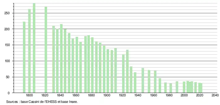 L'évolution du nombre d'habitants est connue à travers les recensements de la population effectués dans la commune depuis 1793. Pour les communes de moins de 10 000 habitants, une enquête de recensement portant sur toute la population est réalisée tous les cinq ans, les populations légales des années intermédiaires étant quant à elles estimées par interpolation ou extrapolation[15]. Pour la commune, le premier recensement exhaustif entrant dans le cadre du nouveau dispositif a été réalisé en 2004[16].