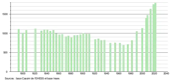 L'évolution du nombre d'habitants est connue à travers les recensements de la population effectués dans la commune depuis 1793. Pour les communes de moins de 10 000 habitants, une enquête de recensement portant sur toute la population est réalisée tous les cinq ans, les populations légales des années intermédiaires étant quant à elles estimées par interpolation ou extrapolation[29]. Pour la commune, le premier recensement exhaustif entrant dans le cadre du nouveau dispositif a été réalisé en 2008[30].