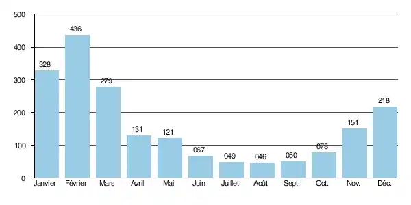Les crues peuvent être très importantes, compte tenu de la petitesse du bassin versant. Les QIX 2 et QIX 5 valent respectivement 8,4 et 13 m3/s. Le QIX 10 est de 17 m3/s, le QIX 20 de 20 m3/s, tandis que le QIX 50 n'a jamais été calculé, faute d'une durée d'observation suffisante pour le faire valablement.