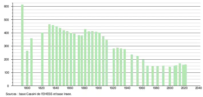 L'évolution du nombre d'habitants est connue à travers les recensements de la population effectués dans la commune depuis 1793. Pour les communes de moins de 10 000 habitants, une enquête de recensement portant sur toute la population est réalisée tous les cinq ans, les populations légales des années intermédiaires étant quant à elles estimées par interpolation ou extrapolation[19]. Pour la commune, le premier recensement exhaustif entrant dans le cadre du nouveau dispositif a été réalisé en 2008[20].