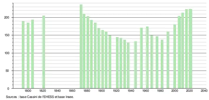 L'évolution du nombre d'habitants est connue à travers les recensements de la population effectués dans la commune depuis 1793. Pour les communes de moins de 10 000 habitants, une enquête de recensement portant sur toute la population est réalisée tous les cinq ans, les populations légales des années intermédiaires étant quant à elles estimées par interpolation ou extrapolation[16]. Pour la commune, le premier recensement exhaustif entrant dans le cadre du nouveau dispositif a été réalisé en 2005[17].