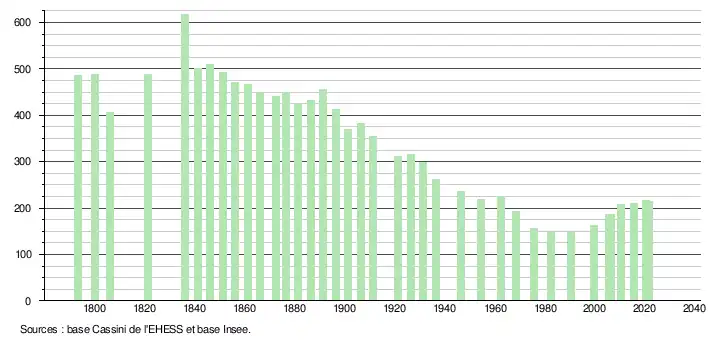 L'évolution du nombre d'habitants est connue à travers les recensements de la population effectués dans la commune depuis 1793. Pour les communes de moins de 10 000 habitants, une enquête de recensement portant sur toute la population est réalisée tous les cinq ans, les populations légales des années intermédiaires étant quant à elles estimées par interpolation ou extrapolation[15]. Pour la commune, le premier recensement exhaustif entrant dans le cadre du nouveau dispositif a été réalisé en 2005[16].