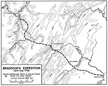 En 1754, Gage est envoyé en Amérique avec le corps expéditionnaire du Général Braddock. Son futur ennemi, George Washington, sert avec lui lors de cette expédition contre les Français. En juillet 1755, le commandant du 44th Regiment, le colonel Sir Peter Halkett, est tué lors de la bataille de la Monongahela. Gage prend le commandement du régiment, il sera légèrement blessé lors du combat. Le régiment est littéralement décimé et le Capitaine Robert Orme (aide de camp du Général Braddock) accuse Gage d'avoir mal conduit les troupes et causé la défaite. Orme démissionnera de l'armée l'année suivante, mais ses accusations empêchèrent Gage d'obtenir le commandement du 44th Regiment.
