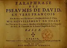 - Paraphrase des pseaumes de David, en vers françois, par Antoine Godeau... et mis nouvellement en chant, par Thomas Gobert... Basse. - Paris, Pierre Le Petit, 1661, 8° oblong. [Partie de basse]. RISM G 2915 et GG 2915.