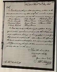 Le 4 janvier 1820, le Boston Patriot and Daily Advertiser rapporte que le commodore Thomas Tingey a récupéré son ouvrier asservi John Howard et que l'agent de Tingey doit le renvoyer dans le district de Columbia[20]. Le 16 août 1821, Tingey publie un avis pour sa cuisinière et gouvernante réduite en esclavage, Sukey Dean, dans lequel il déclare : "Mais quiconque l'obtiendra en prison ou la vendra dans les journaux de la ville pendant trois jours pour de l'argent comptant aura le quart de ce qu'elle aura été vendue en argent comptant, moins les frais éventuels"[21]. En 1822, Tingey écrit à un collègue que Sukey Dean cherche un emploi en tant que femme libre. Tingey donne des détails sur la manière de capturer la femme asservie et des instructions sur la manière de la vendre immédiatement après sa capture[22].