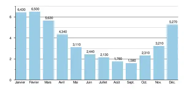 D'autre part, les crues peuvent être assez importantes. Les QIX 2 et QIX 5 valent respectivement 31 et 40 m3/s. Le QIX 10 est de 46 m3/s, et le QIX 20 de 52 m3/s. Quant au QIX 50, il se monte à 78 m3/s. Ceci implique que tous les deux ans, il y ait en moyenne une crue de l'ordre de 31 m3/s, et tous les dix ans, une crue de 46 m3/s[2].