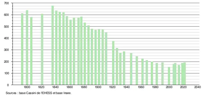 L'évolution du nombre d'habitants est connue à travers les recensements de la population effectués dans la commune depuis 1793. Pour les communes de moins de 10 000 habitants, une enquête de recensement portant sur toute la population est réalisée tous les cinq ans, les populations légales des années intermédiaires étant quant à elles estimées par interpolation ou extrapolation[13]. Pour la commune, le premier recensement exhaustif entrant dans le cadre du nouveau dispositif a été réalisé en 2008[14].