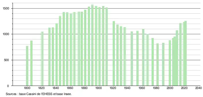 L'évolution du nombre d'habitants est connue à travers les recensements de la population effectués dans la commune depuis 1800. Pour les communes de moins de 10 000 habitants, une enquête de recensement portant sur toute la population est réalisée tous les cinq ans, les populations légales des années intermédiaires étant quant à elles estimées par interpolation ou extrapolation[18]. Pour la commune, le premier recensement exhaustif entrant dans le cadre du nouveau dispositif a été réalisé en 2004[19].