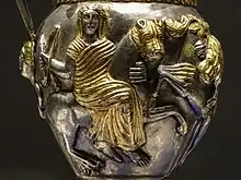 D'autres tombeaux thraces ont été mis au jour en Bulgarie, comme le tombeau de Svechtari découvert en 1982 (classée au patrimoine mondial) connu pour ses cariatides et le tombeau d'Alexandrovo découvert en 2000 qui contient des fresques remarquables[34]. La nécropole de Varna regroupe quant à elle des sépultures allant du Néolithique au Haut Moyen Âge. Enfin, plusieurs trésors ont été retrouvés et témoignent de la haute maîtrise des orfèvres thraces, comme le trésor de Panagyurishté (en) découvert en 1949 et constitué de neuf pièce de vaiselles en or, le trésor de Borovo (en) découvert en 1974 et constitué de cinq pièces en argent datant du règne de Cotys Ier et le trésor de Rogozen découvert en 1985 et constitué de 165 réceptacles.