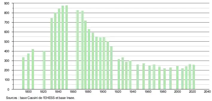 L'évolution du nombre d'habitants est connue à travers les recensements de la population effectués dans la commune depuis 1793. Pour les communes de moins de 10 000 habitants, une enquête de recensement portant sur toute la population est réalisée tous les cinq ans, les populations légales des années intermédiaires étant quant à elles estimées par interpolation ou extrapolation[20]. Pour la commune, le premier recensement exhaustif entrant dans le cadre du nouveau dispositif a été réalisé en 2006[21].