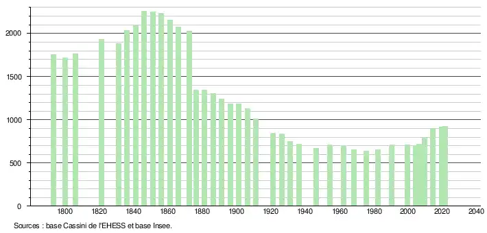L'évolution du nombre d'habitants est connue à travers les recensements de la population effectués dans la commune depuis 1793. Pour les communes de moins de 10 000 habitants, une enquête de recensement portant sur toute la population est réalisée tous les cinq ans, les populations légales des années intermédiaires étant quant à elles estimées par interpolation ou extrapolation[29]. Pour la commune, le premier recensement exhaustif entrant dans le cadre du nouveau dispositif a été réalisé en 2004[30].