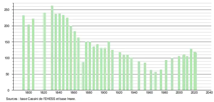 L'évolution du nombre d'habitants est connue à travers les recensements de la population effectués dans la commune depuis 1793. Pour les communes de moins de 10 000 habitants, une enquête de recensement portant sur toute la population est réalisée tous les cinq ans, les populations légales des années intermédiaires étant quant à elles estimées par interpolation ou extrapolation[17]. Pour la commune, le premier recensement exhaustif entrant dans le cadre du nouveau dispositif a été réalisé en 2005[18].