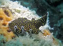 Une paire de pseudo-tentacules plissées en forme d’oreille est placée au milieu de la partie antérieure[2]. Un groupe de taches oculaires cérébrales, disposées en forme de fer à cheval, est présent derrière les pseudo-tentacules[2] mais sont difficilement visibles en raison de la couleur noire du dos[Publication originale 1].