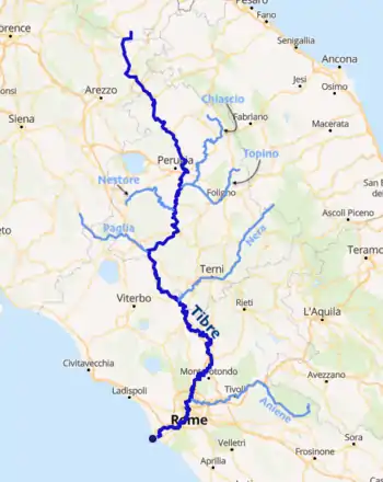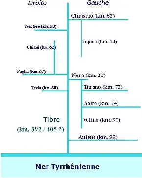 Ses principaux affluents sont le Paglia, grossi du Chiani qui passe à Orvieto, la Nera qui passe à Terni et l'Aniene (ou Teverone) qui arrose Subiaco.