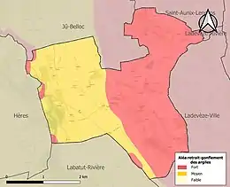 Le retrait-gonflement des sols argileux est susceptible d'engendrer des dommages importants aux bâtiments en cas d’alternance de périodes de sécheresse et de pluie. La totalité de la commune est en aléa moyen ou fort (94,5 % au niveau départemental et 48,5 % au niveau national). Sur les 91 bâtiments dénombrés sur la commune en 2019, 91 sont en aléa moyen ou fort, soit 100 %, à comparer aux 93 % au niveau départemental et 54 % au niveau national. Une cartographie de l'exposition du territoire national au retrait gonflement des sols argileux est disponible sur le site du BRGM[27],[Carte 3].