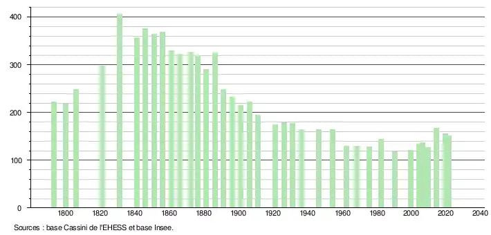 L'évolution du nombre d'habitants est connue à travers les recensements de la population effectués dans la commune depuis 1793. Pour les communes de moins de 10 000 habitants, une enquête de recensement portant sur toute la population est réalisée tous les cinq ans, les populations légales des années intermédiaires étant quant à elles estimées par interpolation ou extrapolation[30]. Pour la commune, le premier recensement exhaustif entrant dans le cadre du nouveau dispositif a été réalisé en 2004[31].