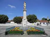 - ce monument inauguré le . se présente sous la forme d'un pilier commémoratif sous la forme d'une colonne quadrangulaire avec, à son sommet, la statue d'un soldat dit « Poilu » de la Première Guerre mondiale, le tout entouré d'une grille[39].