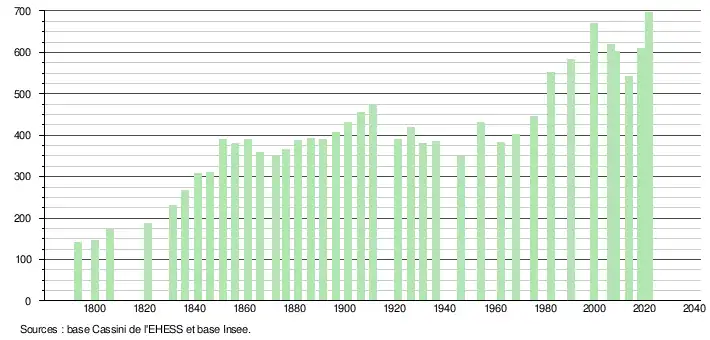 L'évolution du nombre d'habitants est connue à travers les recensements de la population effectués dans la commune depuis 1793. Pour les communes de moins de 10 000 habitants, une enquête de recensement portant sur toute la population est réalisée tous les cinq ans, les populations légales des années intermédiaires étant quant à elles estimées par interpolation ou extrapolation[22]. Pour la commune, le premier recensement exhaustif entrant dans le cadre du nouveau dispositif a été réalisé en 2008[23].