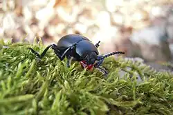 Timarcha tenebricosa émettant de l'hémolymphe par la bouche