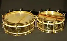 - Timbal de gralles: Il est bas et il est fait en laiton avec deux membranes en cuir. À la membrane inférieure il y a des cordes similaires aux cordes de guitare et qui sonnent en percutire sur la membrane supérieure. Il se tend avec des chevilles.